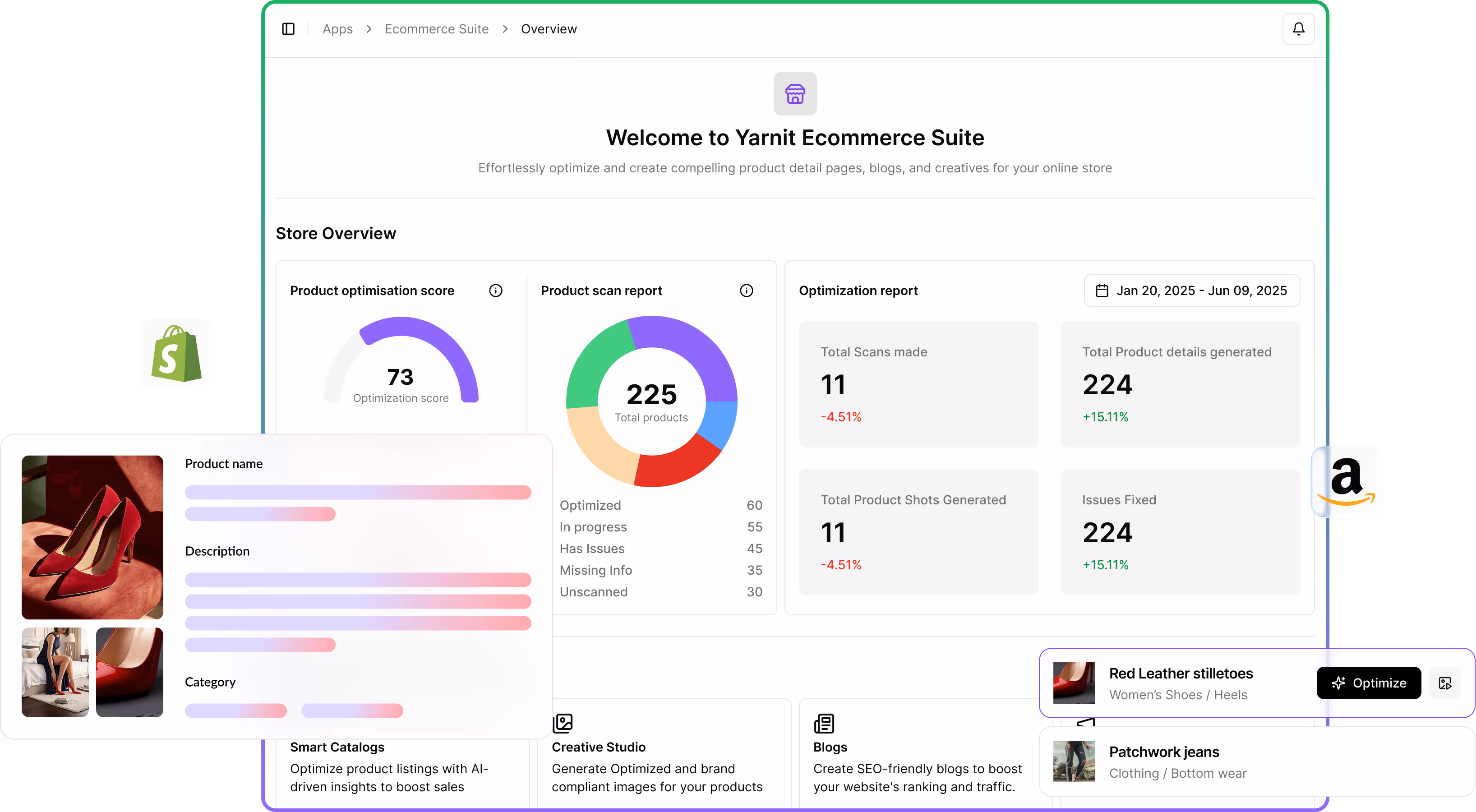 Yarnit analyzes your title, description, images, specs, and metadata like a seasoned catalog manager. It identifies gaps, checks if you’re meeting SEO/AEO and platform requirements, and then generates polished copy, visuals, and recommendations to help your listings perform better.