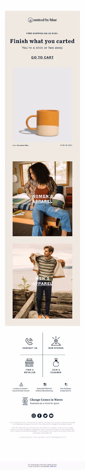 The subject creates a service-oriented vibe, offering curated selections which appeal to shoppers who might be indecisive or overwhelmed. It sets an expectation that the email contains personalized, thoughtful product recommendations. The body delivers on the promise with handpicked product recommendations alongside the cart content. This reduces the cognitive load on the shopper, making it easier to make buying decisions, which is critical in reducing abandonment.