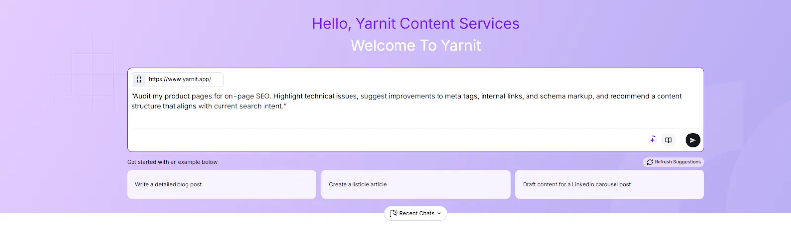 Upload your site audit reports, content drafts, or simply use a prompt like below and also add your site as a reference by using the attachment icon on Ask Yarnit:
