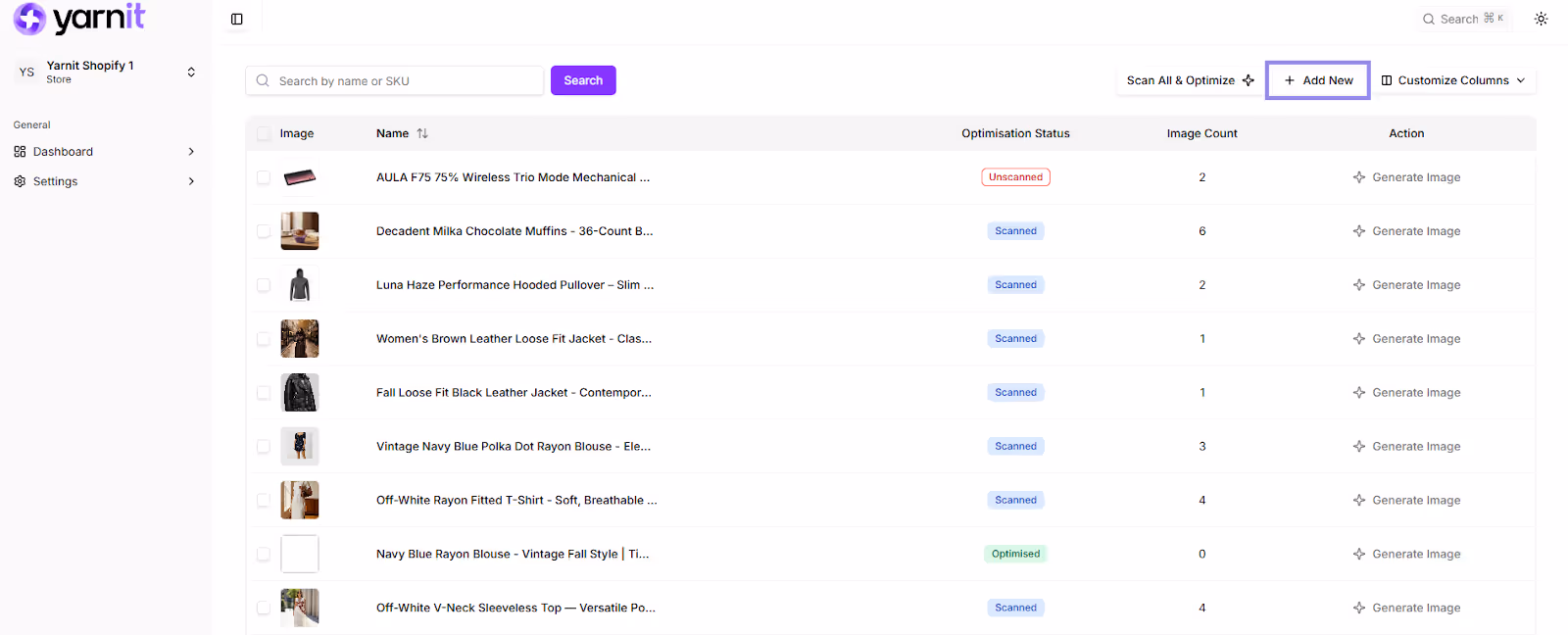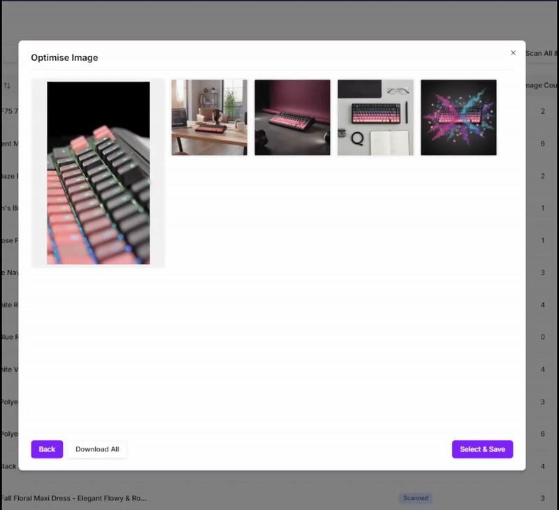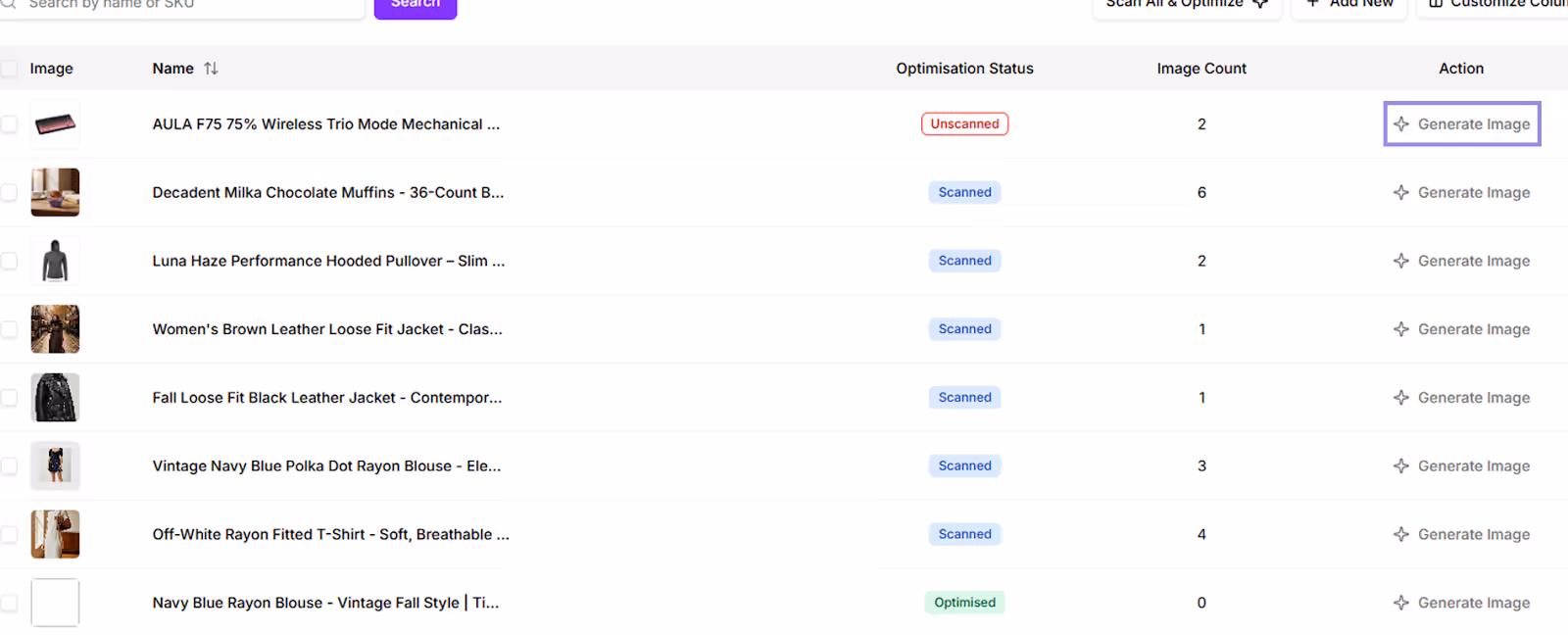 Select any product and click "Generate Image" to open the Optimise Image popup—your creative control center. For this example, we’ll optimize images for mechanical keyboard listing.