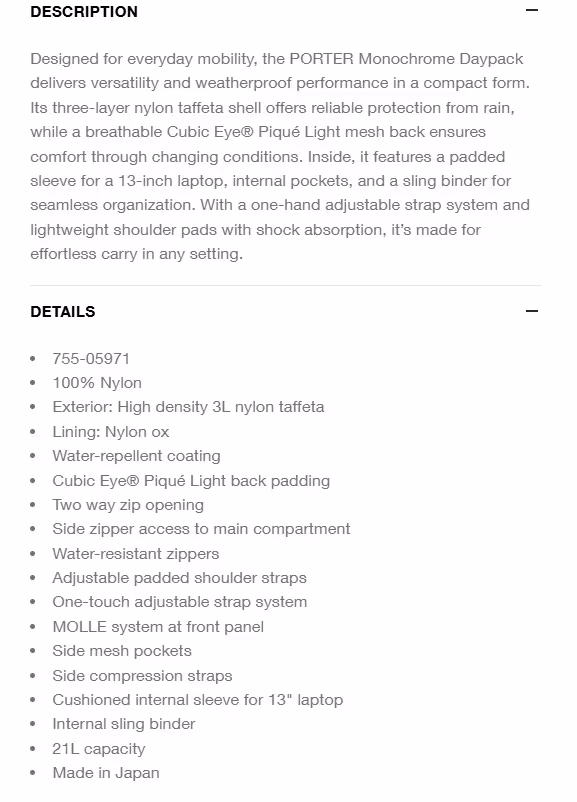 Haven’s duffel bag page does this well by leading with the bag’s versatility and durability before detailing specifications in collapsible tabs. Conversely, a dry list of materials or generic features that are hard to interpret, like “polyester, 45cm,” leaves shoppers confused or unmotivated—as if the product was never designed with their needs in mind.