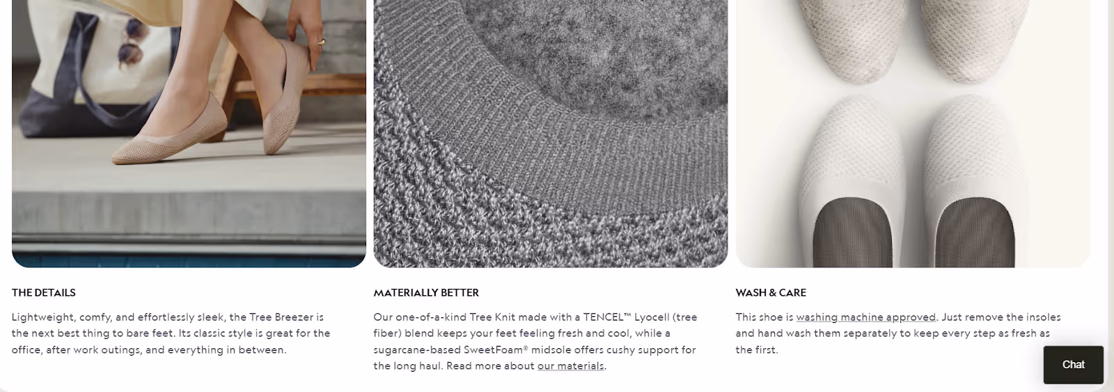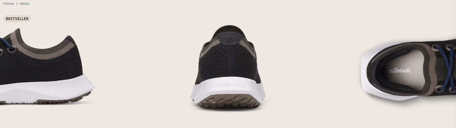 For instance, Allbirds excels with glossy, zoomable images that show their shoes from varied perspectives, alongside lifestyle shots of people wearing them outdoors. This builds trust and excitement.