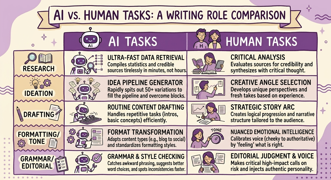 - Strategic decisions about structure and flow. Which section should come first? Where does this example work best? AI can suggest, but you understand your audience and the story arc you're building.