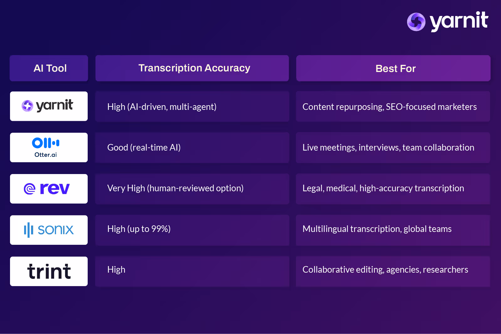 The right AI transcription tool can save you countless hours, improve accuracy, and help you overcome challenges like accents, background noise, and multi-speaker recordings—all while enhancing the SEO value of your content.