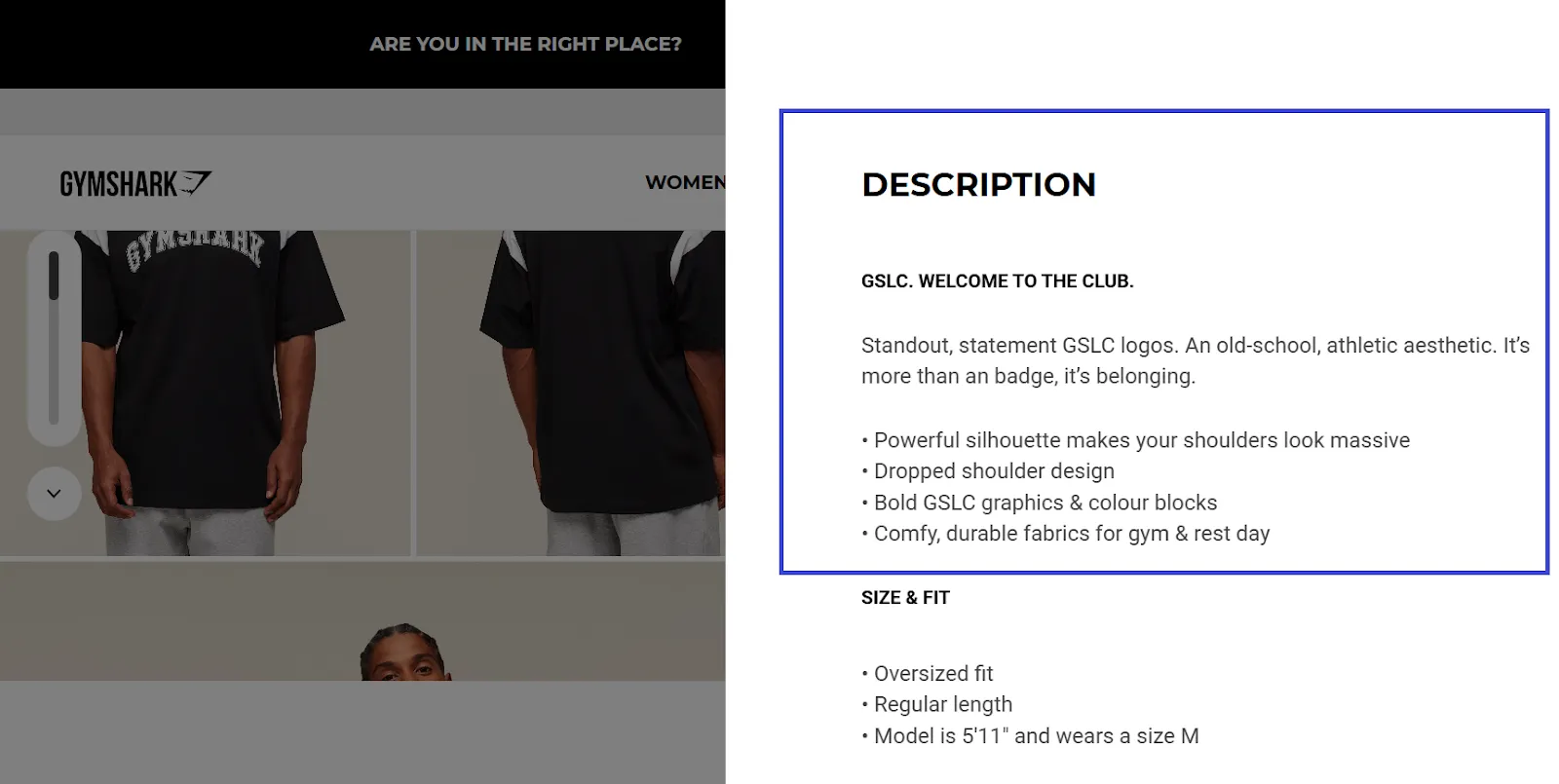 Gymshark, for instance, describes their dropped-shoulder tee in one crisp line—“Dropped-shoulder tee engineered to broaden your frame and elevate your workout style”—checking every box of the 4Cs in a single sentence.