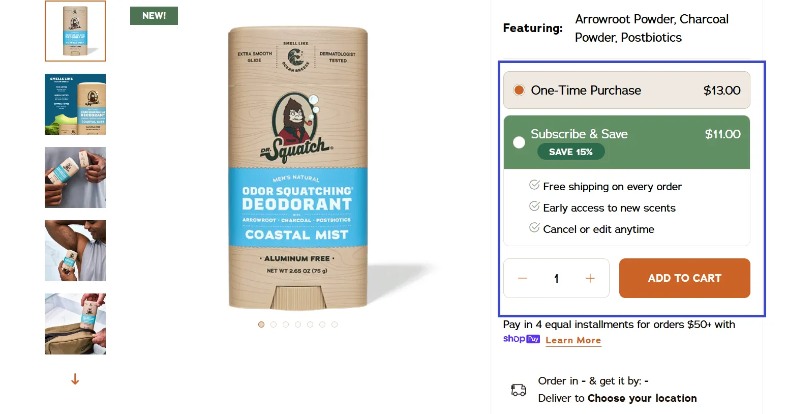 Make buying easy: your "Add to Cart" button should stand out, display availability and shipping, show size guides, and suggest related items. A good CTA is clear and easy to understand, just like Dr. Squatch’s deodorant range, which features a standout, high-contrast “Subscribe and Save” or “Add to Cart” button. This direct and appealing call-to-action makes it easy for customers to complete their purchase, while also presenting options for repeat buying, ensuring a smooth shopping journey that drives conversions.