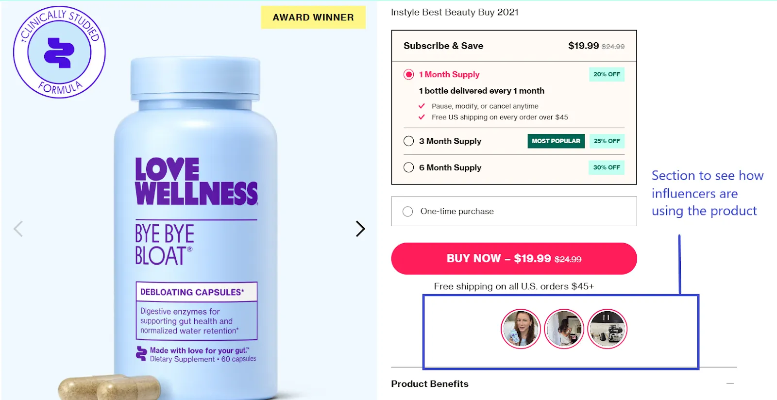 For example, Love Wellness’s Bye Bye Bloat utilises customer data with stats highlighted in the product description. Additionally, it includes a small clickable section for shoppers to see how influencers are using this product.
